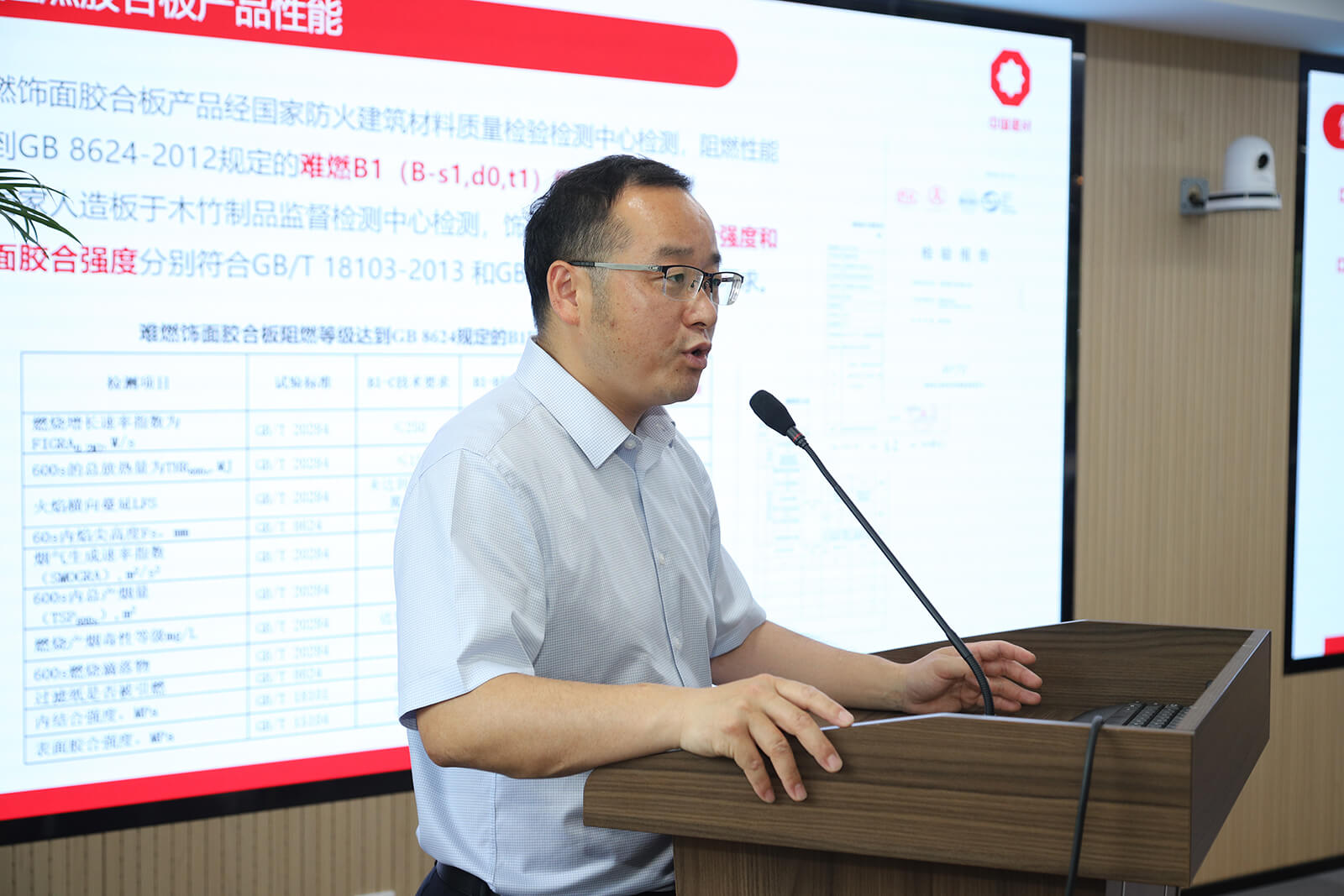 吴玉章博士与张方文经理针对北新木业最新面层阻燃技术及其应用进行了讲解,从专业角度介绍了面层阻燃胶黏剂的原理与阻燃等级、阻燃纸的技术创新点及详细性能参数、水性透明阻燃涂料的工艺和应用,为北新木业的广大合作伙伴进行了专业技术分享。面层阻燃使用的阻燃胶黏剂具有良好耐候性、耐水性、热稳定,通过新型阻燃生产工艺“涂布+热压固化”,保证了产品阻燃功效的持久性,无盐析、吸潮、腐蚀等安全隐患,规避了传统工艺易析出、易反卤、腐蚀金属龙骨、生产成本高等技术和生产难题,生产工艺更简便,大大缩短了生产周期,极大提高了生产效率。